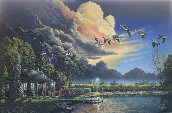 This is an original acrylic painting titled “Cozy Country Cabin”