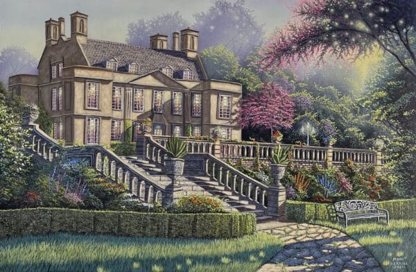 This is an original oil and acrylic painting titled “Early Evening in the Flower Garden”